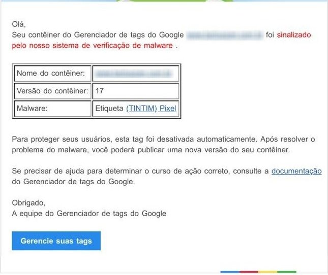 Pela manhã do dia 09 de Setembro de 2025, nós e alguns clientes que utilizam o Pixel do Tintim via Google Tag Manager (GTM) receberam um aviso do próprio GTM informando que o contêiner havia sido sinalizado como possível malware e que a tag havia sido desativada automaticamente.