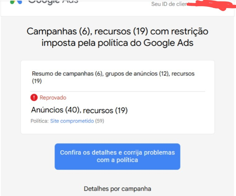 Alguns usuários (incluindo nós do Tintim) também tiveram problemas com anúncios reprovados em suas campanhas, acusando problemas de “site comprometido”.