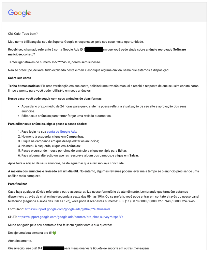 Além disso, estivemos em contato com o próprio Google, tanto via chamado por texto e email, quanto via telefone. A Elisangela, do suporte do Google, nos explicou que a conta foi verificada e está limpa, como você pode ver no print abaixo: